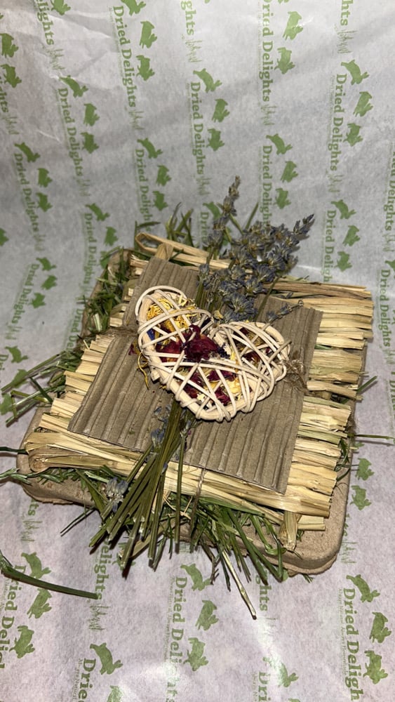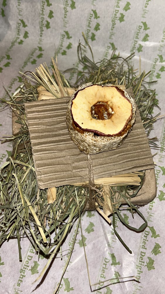 The enrichment item will be a one off original piece and will be full of fresh forage, hay, dried forage, flowers, toys, treats and interesting items- a real showcase of dried delights!!